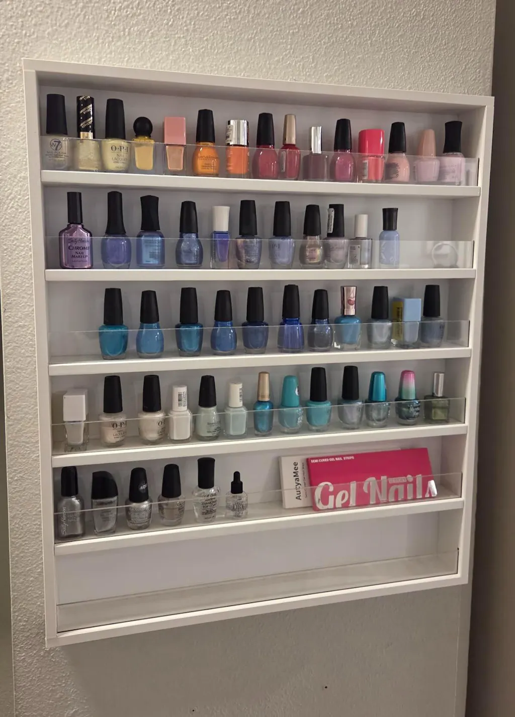 3.【Sturdy & Durable】-The integrated design and lightweight construction allow this nail polish rack to be securely mounted on the wall. Made from MDF material, the nail salon display is acetone-resistant and built to last.