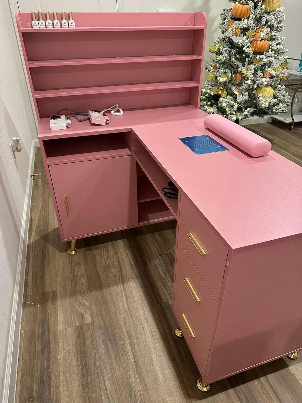 OmySalon MT-LS 52" L Shaped Nail Manicure Table w/Polish Display Rack & Electric Dust Collector & Wrist Rest
