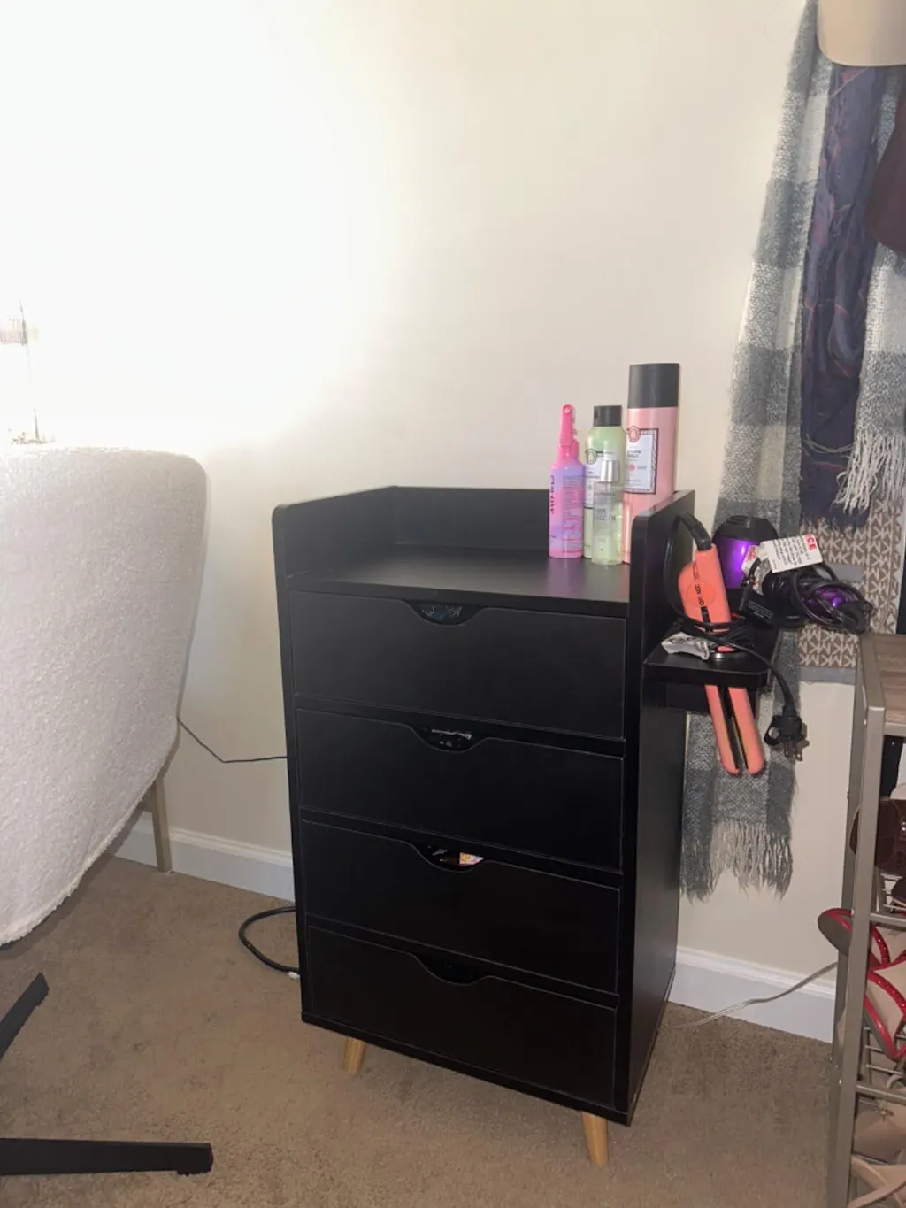 4.【Storage Drawers】- The cabinet is equipped with four drawers, offering ample space to store various tools, such as hair dryers, curling irons, and more. The drawers feature arc handles, making it easy to pull and push without causing any discomfort or harm to your hands.